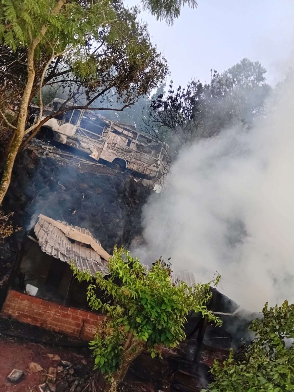 Ao chegar ao local, os bombeiros identificaram um galpão de aproximadamente 40 m² em chamas, com carga de fogo composta por equipamentos motomecanizados e lenha estocada. O galpão estava situado aos pés de um barranco reforçado com parede de pneus, o que facilitou a propagação do fogo até a parte superior, onde estavam estacionados dois microônibus. Um dos veículos foi retirado a tempo, sem danos, enquanto o segundo, com problemas mecânicos, acabou sendo atingido pelas chamas.