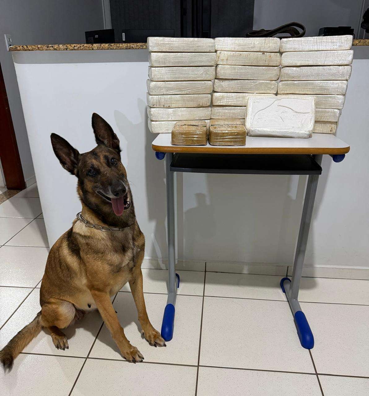 O cão de faro Aika indicou a presença de substâncias ilícitas escondidas em compartimentos do veículo. Após busca detalhada, foram localizados 22 quilos de cocaína e 2 quilos de crack, armazenados sob a forração interna das portas e do assoalho. O condutor recebeu voz de prisão, e o veículo, junto com as drogas, foi encaminhado à Central de Flagrantes.
