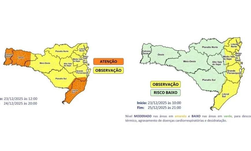 O Natal de 2025 em Santa Catarina será marcado por calor intenso e risco de temporais isolados em todas as regiões do estado. As temperaturas devem chegar a 30 °C, com máximas de até 35 °C no Litoral, segundo a Defesa Civil.
