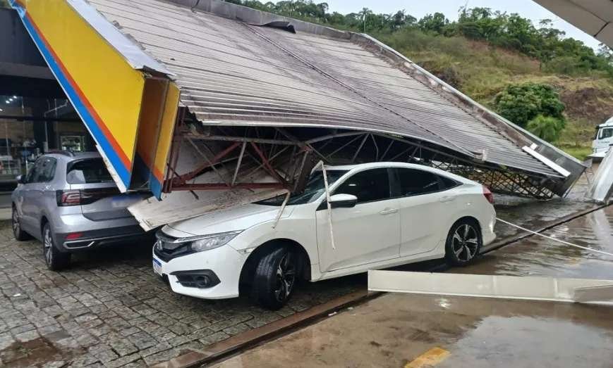 Uma microexplosão foi a responsável pela queda do telhado de um posto de combustível em cima de um carro em Gaspar, no Vale do Itajaí, em Santa Catarina, na tarde de quinta-feira (8). A informação foi confirmada pela Defesa Civil estadual após a análise das imagens dos estragos (assista acima). Ninguém se feriu.