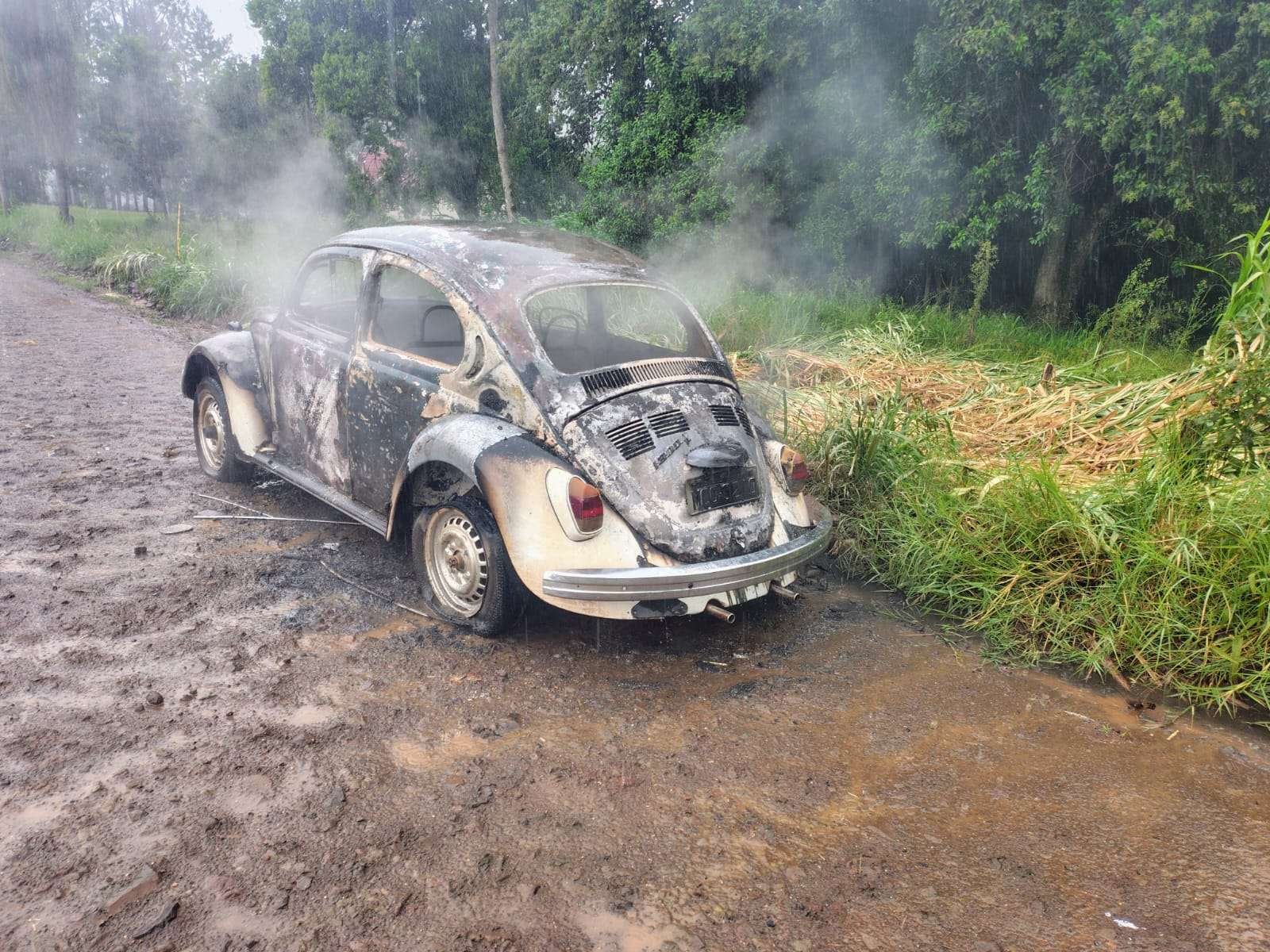 Um veículo Volkswagen Fusca foi completamente consumido pelas chamas na tarde do dia 10 de fevere...