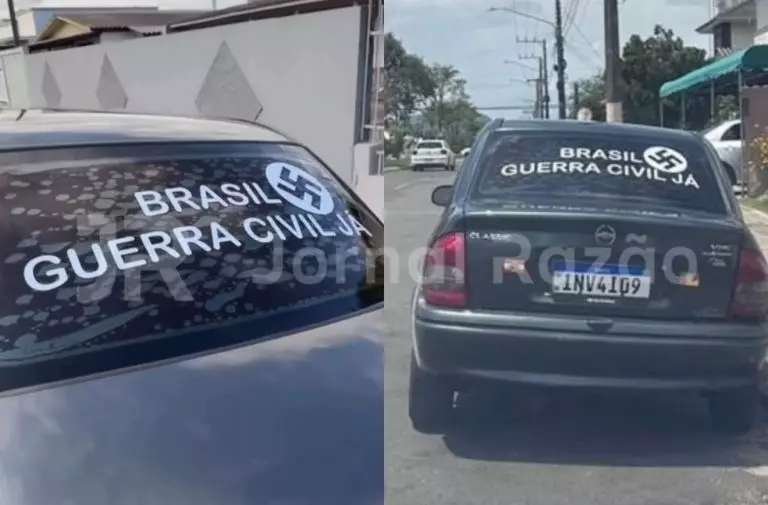 Mesmo com a ausência do condutor, a Polícia Militar registrou formalmente a ocorrência e determinou a remoção do veículo, que foi encaminhado à delegacia por ser considerado objeto de crime. A legislação brasileira prevê que a divulgação de símbolos, emblemas ou mensagens associadas ao nazismo configura crime inafiançável.
