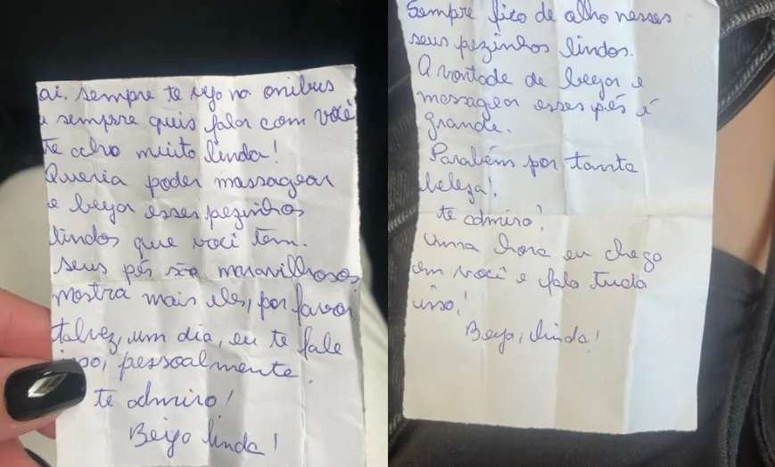 "Seus pés são maravilhosos, mostra mais eles, por favor. Talvez, um dia, eu te fale isso pessoalmente", diz um dos recados.