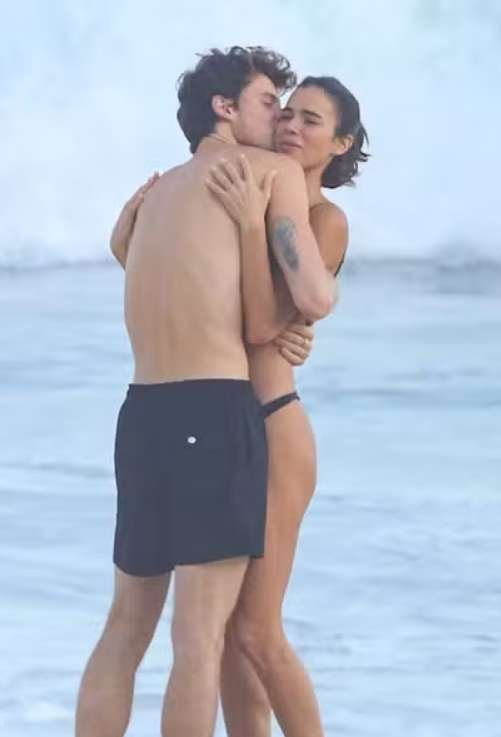 Dentro d'água, a atriz, de 30 anos de idade, e o cantor canadense, de 27, jogaram água um no outro e se divertiram às gargalhadas. Em algumas imagens, Shawn tinha a mão na cintura de Bruna - ele usou um bermudão preto e ela um biquíni da mesma cor. Na hora de ir embora, ela se enrolou em uma toalha listrada.