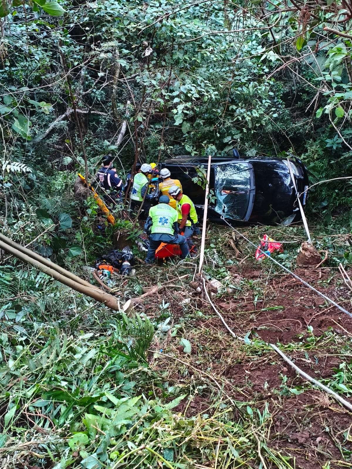 Um grave acidente de trânsito foi registrado na tarde de domingo (19), na linha Platanéia, interior de Novo Horizonte. A ocorrência, do tipo saída de pista seguida de queda em ribanceira, mobilizou equipes do Corpo de Bombeiros Militar e do Samu.