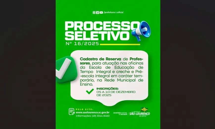 A Prefeitura de São Lourenço do Oeste abriu as inscrições para Processo Seletivo, com o objetivo de formar cadastro de reserva de Professores para atuação temporária nas oficinas da Escola de Educação de Tempo Integral.