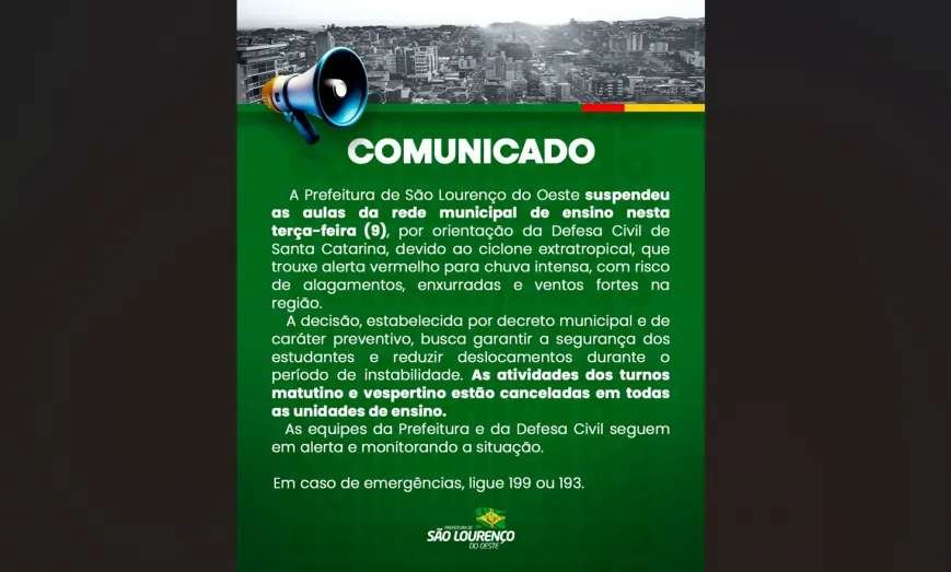 A Prefeitura de São Lourenço do Oeste suspendeu todas as aulas da rede municipal de ensino nesta terça-feira (9), após a emissão de alerta vermelho pela Defesa Civil de Santa Catarina em razão da atuação de um ciclone extratropical sobre a região.