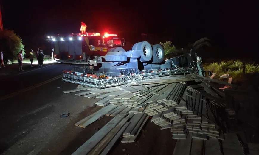 No local, o Corpo de Bombeiros confirmou que se tratava de um caminhão Ford Cargo que transportava carga de madeira e encontrava-se totalmente capotado.